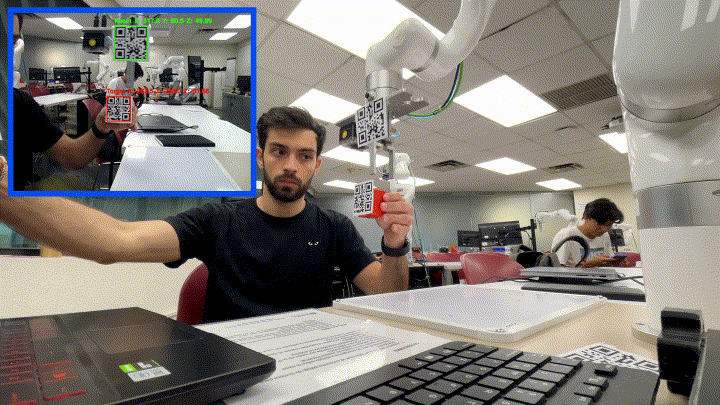 Python project for visual servoing of a 6-DOF robotic arm (xArm 6). An external camera is used to identify two QR codes, one with the word ‘robot’ encoded corresponding to the arm’s gripper position, and other with the word ‘target’ encoded, used to identify the target object’s position.